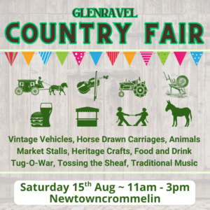 Vintage Vehicles, Horse Drawn Carriages, Animals, Market Stalls, Heritage Crafts, Food & Drink, Tug-O-War, Tossing the sheaf, Traditional Music all in the rural village of Newtowncrommelin